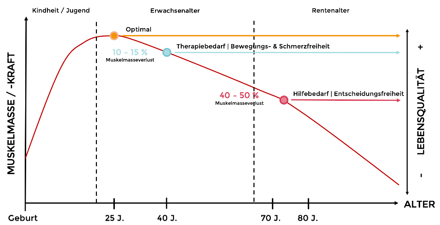 Durch langes Sitzen und wenig Muskelaktivität baut die Muskulatur ab. Bereits ab dem 25. Lebensjahr verlieren wir ohne Training jährlich bis zu 1 % Muskelmasse. Bis zum 70. Lebensjahr können so 40–55 % Muskelkraft verloren gehen. Die gute Nachricht: Mit gezieltem Training lässt sich dieser Prozess aufhalten oder sogar umkehren.